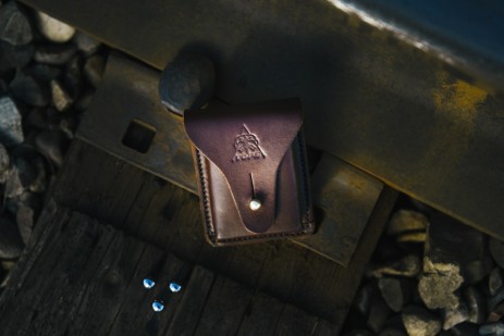 This brown leather bushcraft pouch is the perfect compliment to any bushcrafter's kit. The inside size of the pouch is approximately 3" deep by 2" wide by 1.75" thick. The belt loop on the back side is made to be worn vertically or horizontally. The pouch is great for carrying slingshot ammo for your TOPS Sling, a fire kit, a sharpening kit, tinder collected around the campsite, wild edibles you find while exploring, or other small items that you might want to keep outside of your pack. The top closure folds down and is secured with a stud for silent opening and closing of the pouch.